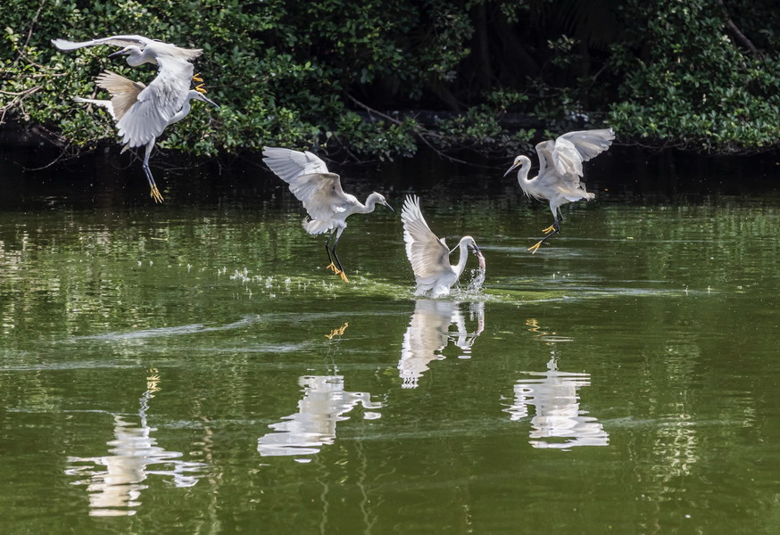 4月15日,攝于南山區(qū)華僑城天鵝堡附近。這是深圳拍鷺鳥的其中一個(gè)好去處。四只白鷺在水面上爭(zhēng)相捕食。徐捷
