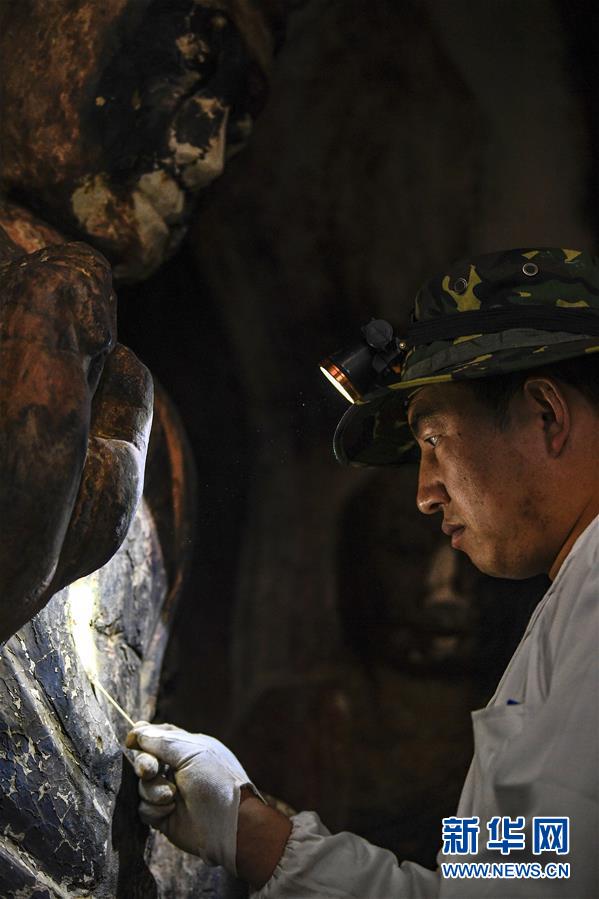 4月27日,文物修復專家在寧夏須彌山石窟圓光寺48號窟內(nèi)開展修復工作。新華社記者馮開華攝