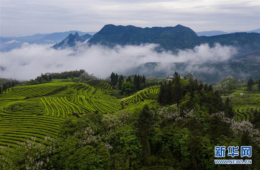 俯瞰鹿鳴茶海一角(4月28日無(wú)人機(jī)照片)。四川省珙縣的鹿鳴茶海,常年云霧繚繞,茶壟依山分布,美不勝收。新華社記者江宏景攝