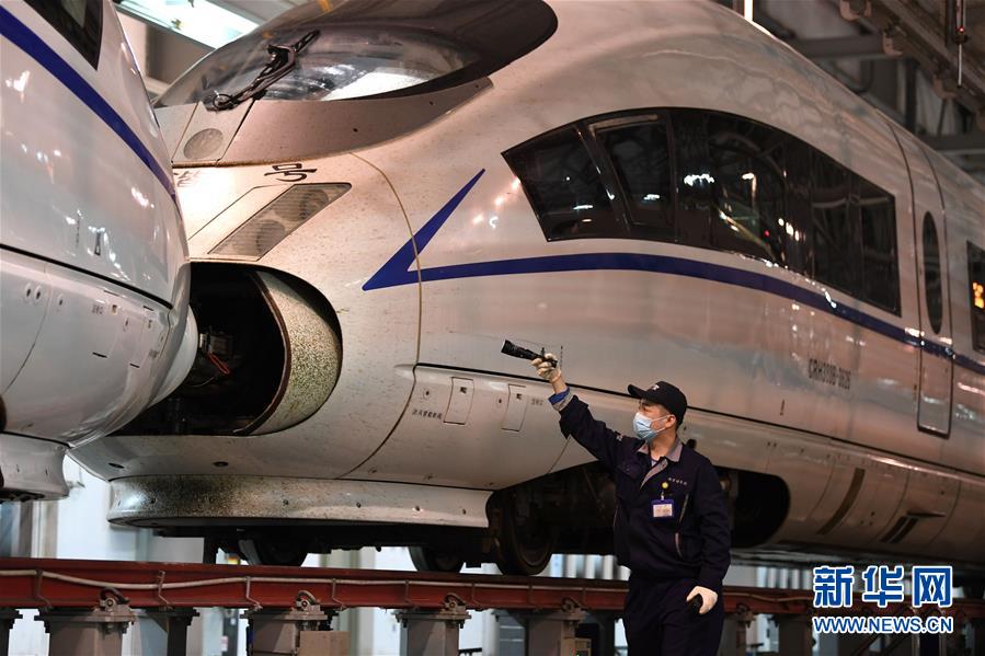 4月29日夜,合肥南動車運(yùn)用所的工作人員對動車組進(jìn)行檢修。每當(dāng)夜深人靜的時候,合肥南動車運(yùn)用所卻燈火通明,“動車安全守護(hù)者”們堅守崗位,對動車組進(jìn)行全面細(xì)致檢修。新華社記者 劉軍喜 攝