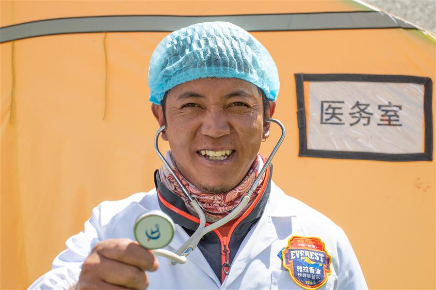 高山醫(yī)生阿旺羅布在珠峰大本營(5月8日攝)。5月8日是世界微笑日。在海拔5200米的珠峰大本營,參與2020珠峰高程測量的各方人員,微笑期待本次測量活動的圓滿成功。