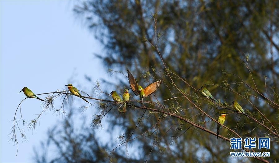 在海口五源河下游蜂虎保護(hù)小區(qū),栗喉蜂虎在樹(shù)枝上休息(5月7日攝)。新華社記者楊冠宇攝