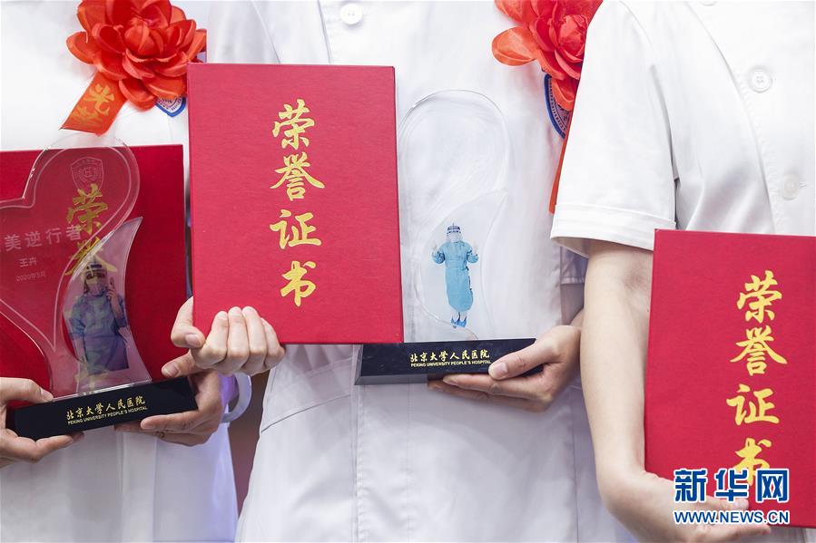 5月11日,獲獎(jiǎng)護(hù)士在護(hù)士節(jié)活動(dòng)上手捧獎(jiǎng)杯和證書。在國際護(hù)士節(jié)到來之際,北京大學(xué)人民醫(yī)院11日舉辦慶祝護(hù)士節(jié)暨優(yōu)秀集體和個(gè)人表彰活動(dòng),并邀請?jiān)踽t(yī)療隊(duì)護(hù)士代表分享戰(zhàn)“疫”故事。我國今年護(hù)士節(jié)的主題為“致敬護(hù)士隊(duì)伍,攜手戰(zhàn)勝疫情”。新華社記者張玉薇攝