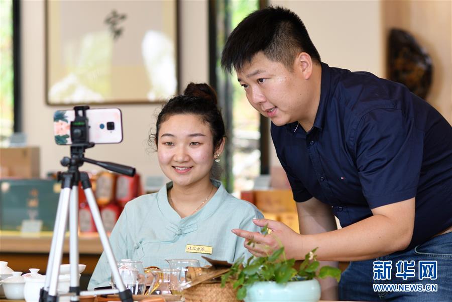 方舟(右)在指導(dǎo)公司員工使用電商平臺(tái)直播銷售武夷巖茶(5月10日攝)。新華社記者魏培全攝