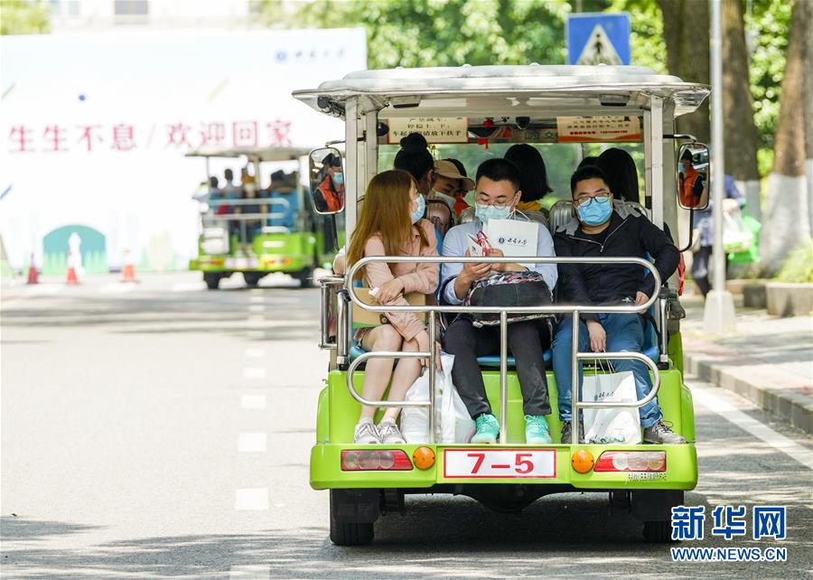 5月15日,在西南大學(xué)校園內(nèi),學(xué)生們搭乘校內(nèi)轉(zhuǎn)運(yùn)車前往各自的宿舍。當(dāng)日,重慶西南大學(xué)迎來疫情以來首批返校大學(xué)生。據(jù)介紹,按照疫情防控的需要,重慶市高校2020年春季學(xué)期從5月11日起按照“一校一策”原則,實(shí)行錯峰錯時分批次有序開學(xué)復(fù)課。新華社記者劉潺攝