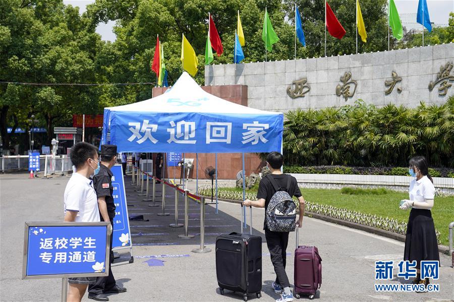5月15日,在西南大學(xué)的返校學(xué)生專用通道前,學(xué)生按照工作人員和志愿者的引導(dǎo)有序進(jìn)入校區(qū)。當(dāng)日,重慶西南大學(xué)迎來疫情以來首批返校大學(xué)生。據(jù)介紹,按照疫情防控的需要,重慶市高校2020年春季學(xué)期從5月11日起按照“一校一策”原則,實(shí)行錯峰錯時分批次有序開學(xué)復(fù)課。新華社記者劉潺攝