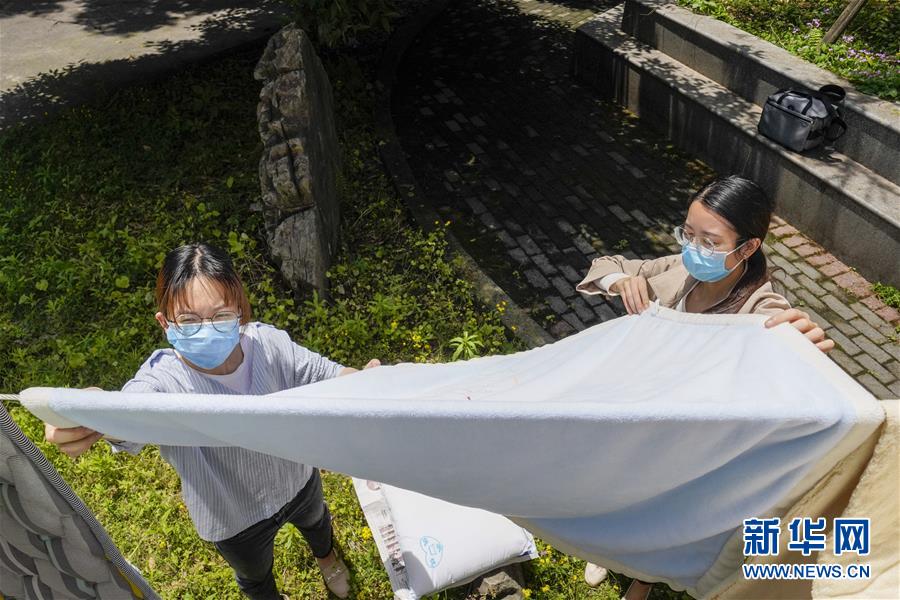 5月15日,在西南大學(xué)一棟宿舍樓下,一名返校大學(xué)生(左)在輔導(dǎo)員老師的幫助下曬被子。當(dāng)日,重慶西南大學(xué)迎來疫情以來首批返校大學(xué)生。據(jù)介紹,按照疫情防控的需要,重慶市高校2020年春季學(xué)期從5月11日起按照“一校一策”原則,實(shí)行錯峰錯時分批次有序開學(xué)復(fù)課。新華社記者劉潺攝