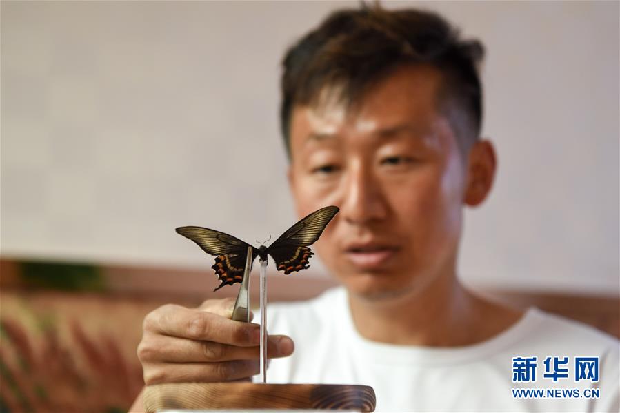 在吉木薩爾縣七彩蝶園,關富云在制作蝴蝶標本(5月15日攝)。走進關富云的七彩蝶園,游客不僅可以近距離接觸翩翩起舞的蝴蝶,還可以欣賞蝴蝶破繭成蝶的蛻變過程。今年34歲的關富云用9年的時間實現(xiàn)了自己的“蝴蝶夢”,完成美麗的“蝶變”。關富云家住新疆吉木薩爾縣北地社區(qū)。2011年,他看到一檔農(nóng)業(yè)致富節(jié)目,萌生了養(yǎng)殖蝴蝶的想法。關富云說,當時蝴蝶養(yǎng)殖還是一種新興產(chǎn)業(yè),他抱著試一試的想法,在海南學習了3個月蝴蝶養(yǎng)殖,帶回100多個蝶蛹在家試驗養(yǎng)殖。蝴蝶的生存周期短,在當?shù)仞B(yǎng)殖需要克服溫度、濕度、病蟲害等問題。關富云不斷嘗試,越挫越勇,羽化成功的蝴蝶在2014年終于突破了萬只。蝴蝶的色彩艷麗,活體蝴蝶可用于婚慶、開業(yè)慶典等活動中放飛,可以取得很好的收益。但它的生命短暫,如何才能最大化蝴蝶的效益,留住它的美呢?關富云動起了心思,開始嘗試制作標本和蝶翅畫?!昂宛B(yǎng)殖不同,做蝶翅畫是個創(chuàng)作的過程,從選擇標本到粘貼,每一步都要突出美感?!标P富云介紹,一幅色彩明艷、栩栩如生的蝶翅畫耗時多日才能完成。如今,關富云的活體蝴蝶和蝶翅畫通過線上線下銷售,產(chǎn)品還銷往北京、廈門等地。關富云的蝴蝶產(chǎn)品得到市場的認可,政府也對他給予大力支持。2019年,吉木薩爾縣在泉子街鎮(zhèn)建起蝴蝶觀賞園,吸引了不少游客到此參觀游玩。對于未來的發(fā)展,關富云信心滿滿,“我希望把蝴蝶產(chǎn)業(yè)發(fā)展到天山南北,讓人們在寒冷的冬季也能觀賞到蝴蝶,并且讓更多人參與其中,致富脫貧”。新華社記者丁磊攝