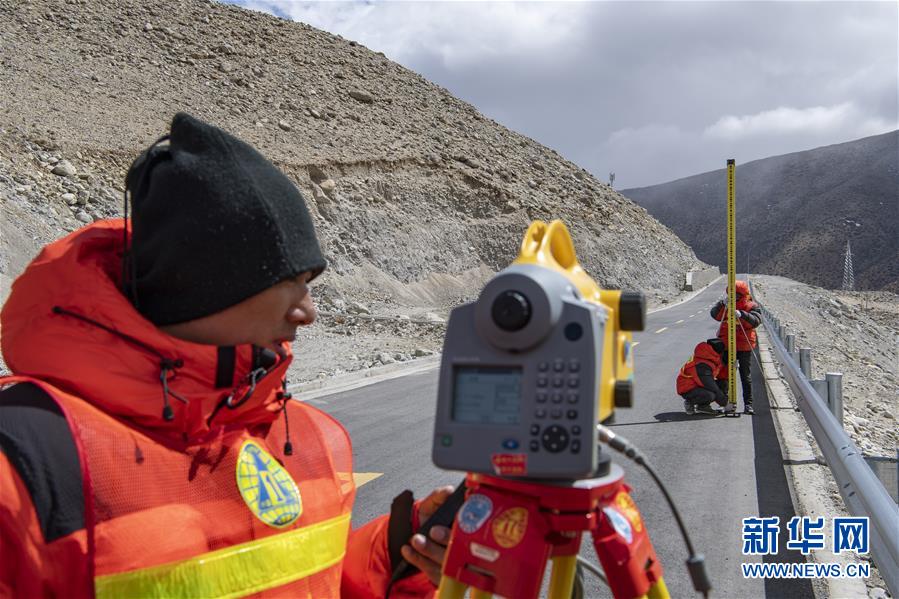 國測一大隊隊員在日喀則市定日縣曲當(dāng)鄉(xiāng)境內(nèi)進(jìn)行水準(zhǔn)測量(4月18日攝)。新華社記者孫非攝