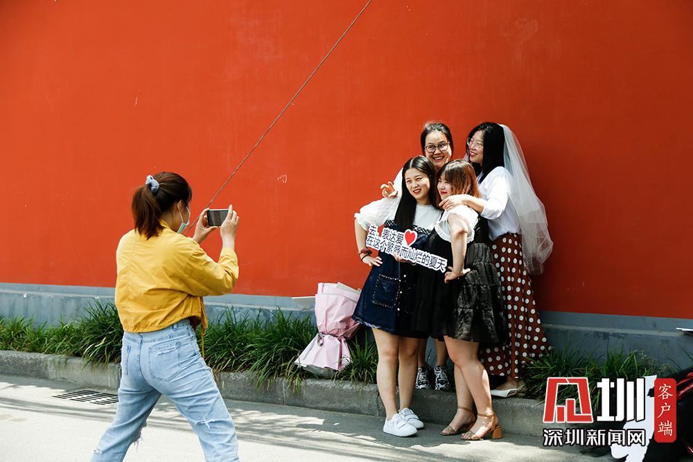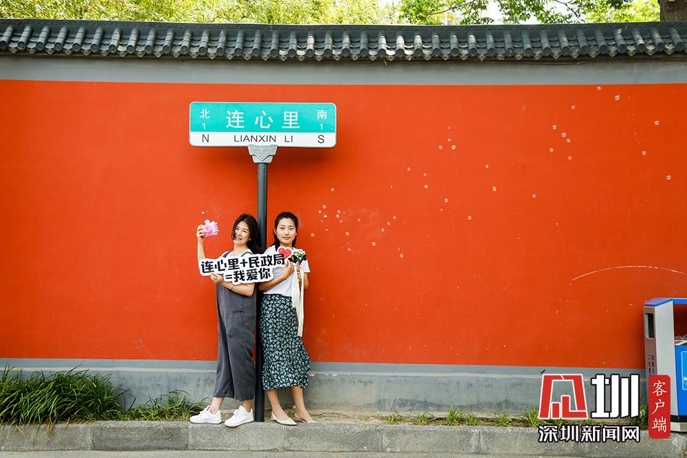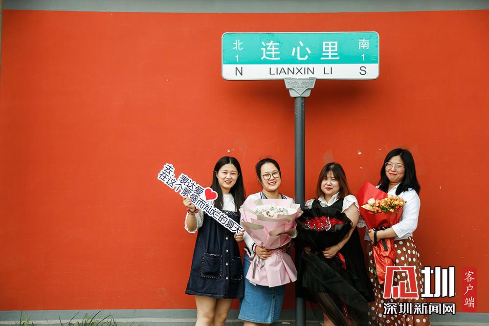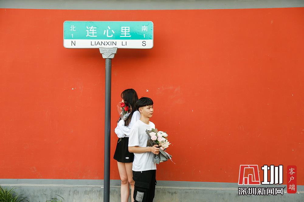 不過,在5月20日當天來這里拍照的情侶或夫妻并不多,反倒有眾多“單身狗”與同性閨蜜一起,在“連心里”的路牌下、紅墻邊,手捧鮮花拍照打卡。