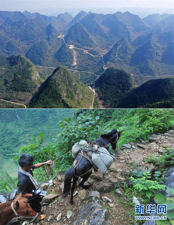 是一張拼版照片。上圖是已經修通公路的大化瑤族自治縣板升鄉(xiāng)弄勇村弄為屯以及周邊村屯(2019年11月11日攝,無人機照片)。下圖:在弄勇村弄為屯,村民用馬將建筑材料馱回家,用于修建新房(2014年6月18日攝)。目前,包括弄為屯在內,弄勇村已基本實現(xiàn)屯屯通公路。新華社記者黃孝邦攝