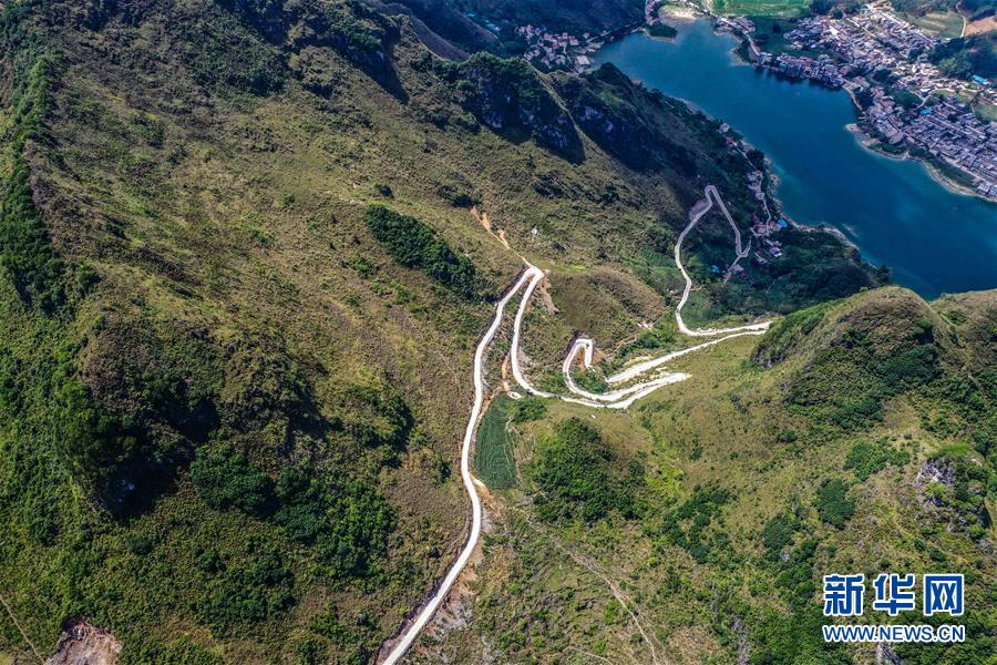 這是去年底通車的大化瑤族自治縣七百弄鄉(xiāng)江棟村那徐屯至弄獎屯公路(5月14日攝,無人機(jī)照片)。新華社記者曹祎銘攝
