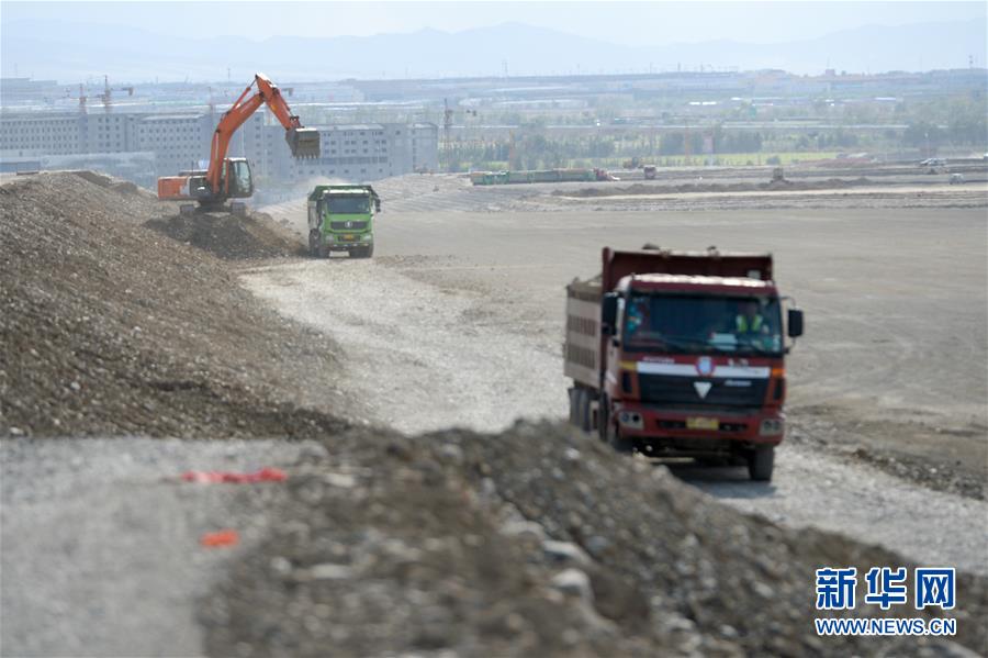 5月23日,在烏魯木齊機(jī)場(chǎng)改擴(kuò)建工程施工現(xiàn)場(chǎng),施工車(chē)輛在飛行區(qū)進(jìn)行土方回填作業(yè)。新華社記者丁磊攝