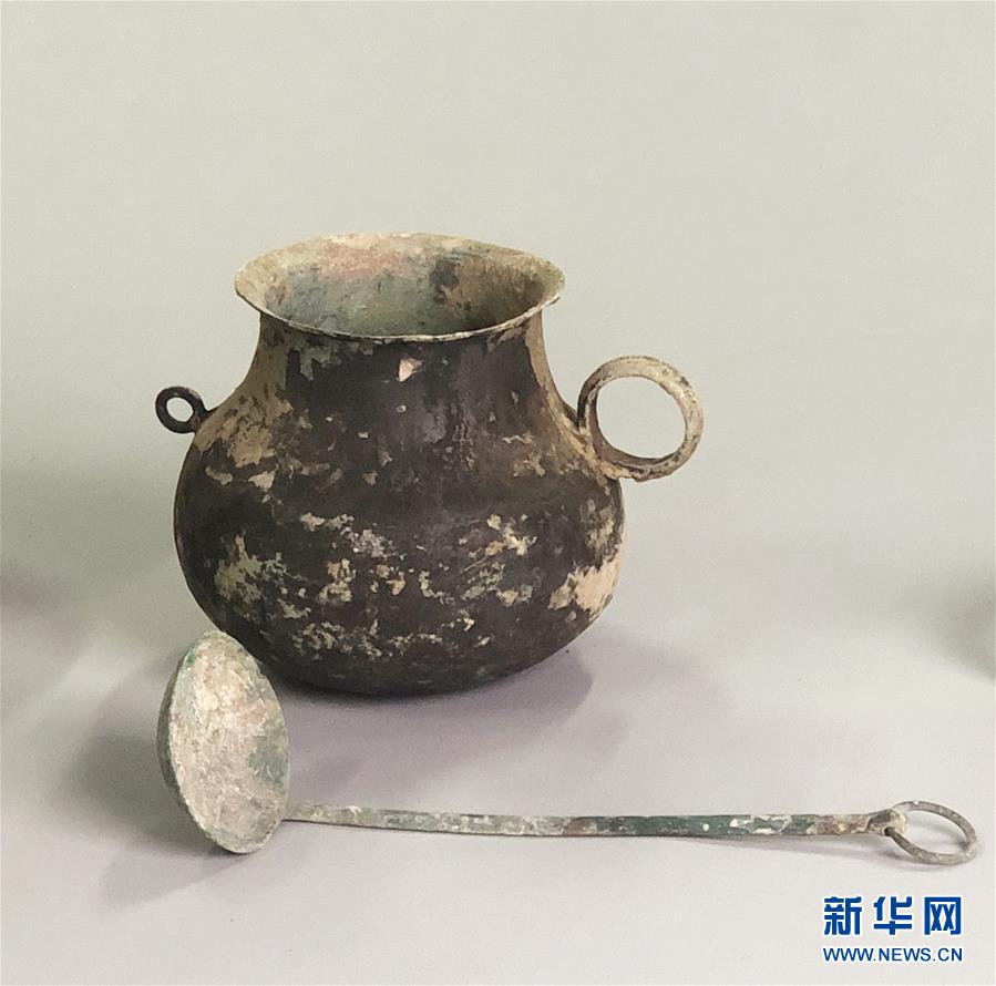 發(fā)掘出土的銅鍪與銅勺(5月22日攝)。新華社記者李麗靜攝