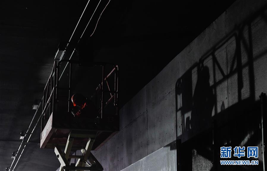 5月23日,工人在??谖拿鳀|越江通道項目隧道內安裝照明設備。新華社記者楊冠宇攝