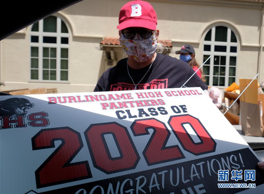5月22日,在美國加州北部圣馬特奧縣,工作人員歡迎來辦理畢業(yè)手續(xù)的學生。新華社記者吳曉凌攝