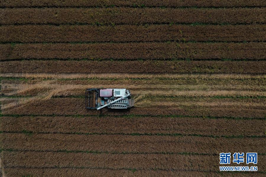5月24日,農(nóng)戶(hù)駕駛收割機(jī)在浙江省湖州市吳興區(qū)八里店鎮(zhèn)尹家圩糧油植保農(nóng)機(jī)專(zhuān)業(yè)合作社的麥田里進(jìn)行收割作業(yè)(無(wú)人機(jī)照片)。新華社記者黃宗治攝