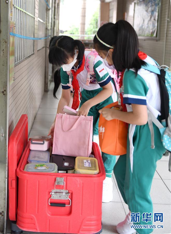 5月25日,廣州市荔灣區(qū)蔣光鼐紀(jì)念小學(xué)的學(xué)生將自帶的飯盒放在教室門口的箱子里,工作人員將為學(xué)生統(tǒng)一配餐。當(dāng)日,廣州市各小學(xué)一至三年級(jí)學(xué)生正式開學(xué)復(fù)課。至此,廣州市中小學(xué)各年級(jí)已全部開學(xué)復(fù)課。新華社記者盧漢欣攝
