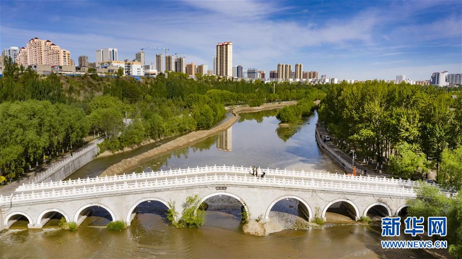 5月24日,市民在榆林市榆溪河生態(tài)長廊休閑(無人機照片)。新華社記者陶明攝