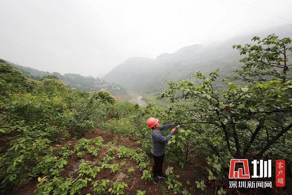 2020年5月27日,在貴州省畢節(jié)市納雍縣化作鄉(xiāng)雙巖頭村,村民對(duì)櫻桃進(jìn)行田間管理。