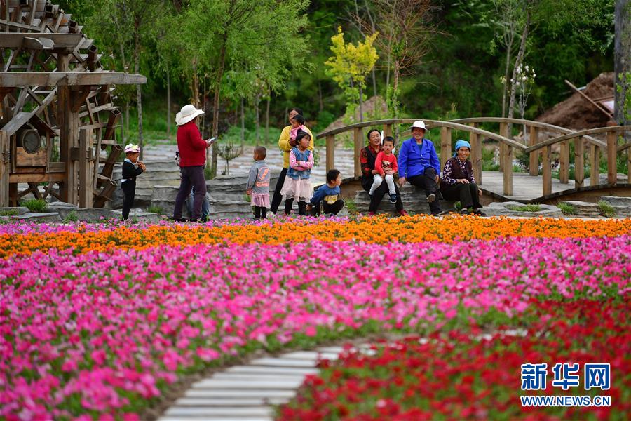5月28日,村民在甘南藏族自治州臨潭縣八角鎮(zhèn)牙扎村的花海景點休憩。