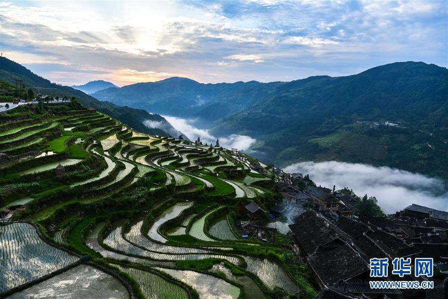 晨光中的從江縣加榜鄉(xiāng)加車梯田(5月27日攝)。夏日時(shí)節(jié),位于貴州省黔東南苗族侗族自治州從江縣加榜鄉(xiāng)加車、加頁、黨扭等苗寨的梯田在晨霧與陽光的映襯下線條分明,光影變幻,景色如畫。新華社記者 楊文斌 攝