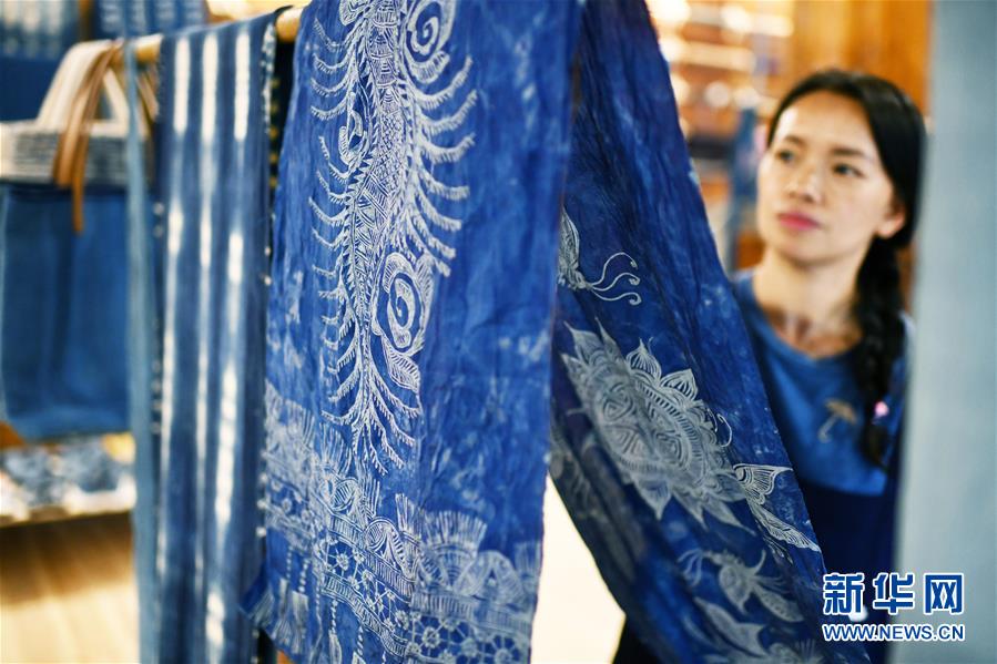 2018年,楊成蘭在村里成立傳統(tǒng)織染合作社,吸引村里及周邊村寨貧困戶入股,帶動(dòng)當(dāng)?shù)刎毨艉痛迕窦尤牒献魃?,從事織布、染布、藍(lán)靛種植等產(chǎn)業(yè),在傳承民族傳統(tǒng)手工技藝的同時(shí),幫助村民脫貧增收。新華社記者楊文斌攝