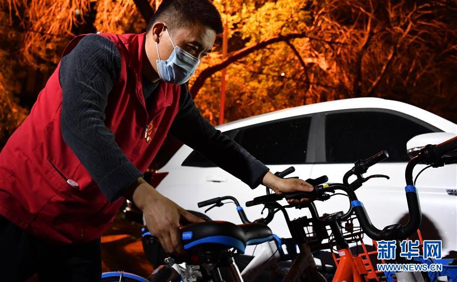 楊龍明將搬出小區(qū)的共享單車擺放整齊(6月1日攝)。新華社記者李然攝。