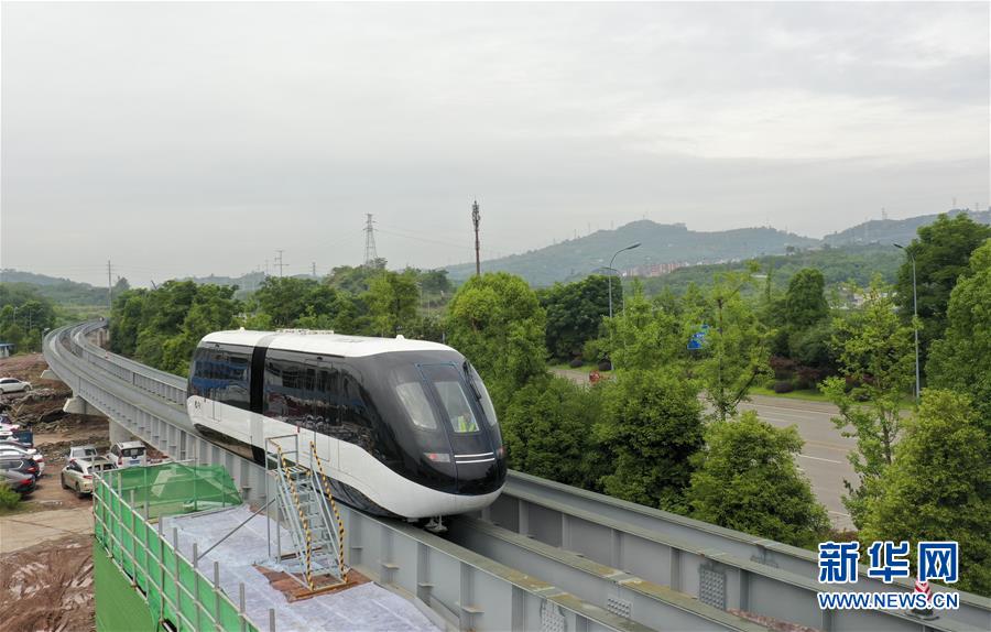 6月3日,一臺“云巴”在專用運行軌道上進行調(diào)試(無人機照片)。近日,重慶市首條“云巴”示范線項目在重慶璧山區(qū)正式亮相。此次發(fā)布的“云巴”采用電能驅(qū)動,具有轉(zhuǎn)彎半徑小、爬坡能力強、噪音低、安全性高、建設成本低、建造周期短等優(yōu)勢,能為乘客提供更智能、舒適、便捷的出行體驗。據(jù)介紹,璧山區(qū)“云巴”示范線項目自2019年8月開建,線路正線全長15.4km,共設車站15座,預計2020年9月全線通車。新華社記者劉潺攝。