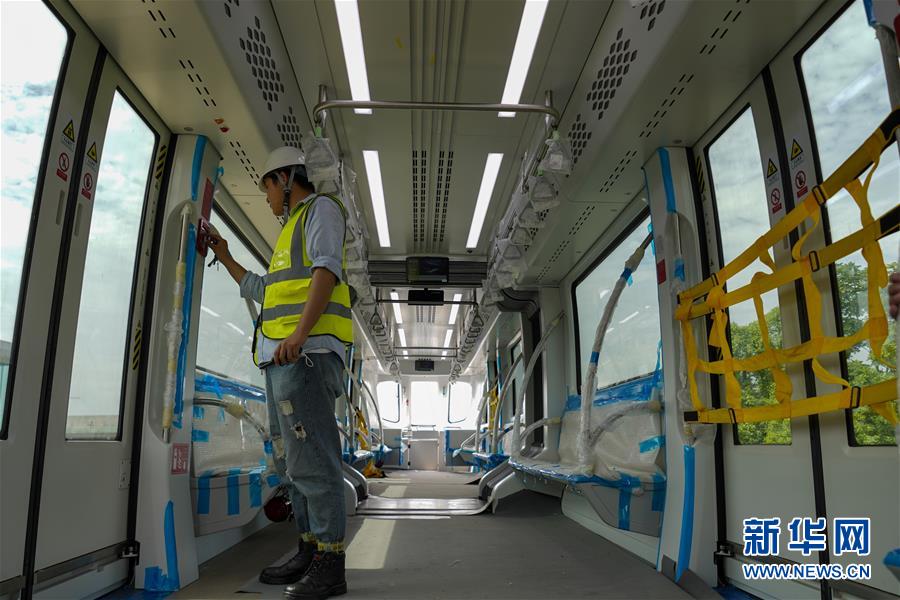 6月3日,工程技術人員在“云巴”車廂內(nèi)對安裝的電氣設備進行調(diào)試。近日,重慶市首條“云巴”示范線項目在重慶璧山區(qū)正式亮相。此次發(fā)布的“云巴”采用電能驅(qū)動,具有轉(zhuǎn)彎半徑小、爬坡能力強、噪音低、安全性高、建設成本低、建造周期短等優(yōu)勢,能為乘客提供更智能、舒適、便捷的出行體驗。據(jù)介紹,璧山區(qū)“云巴”示范線項目自2019年8月開建,線路正線全長15.4km,共設車站15座,預計2020年9月全線通車。新華社記者劉潺攝。