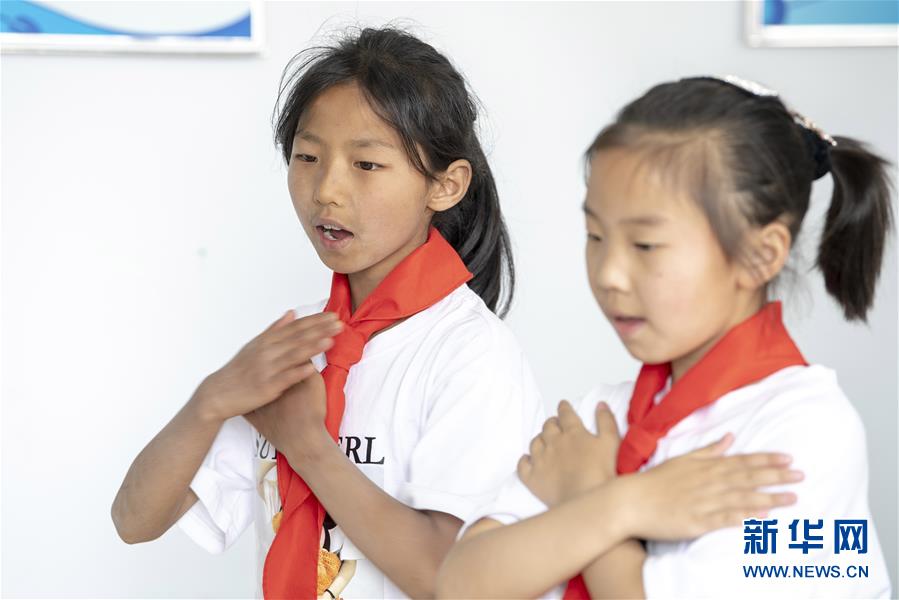 6月2日,在開學(xué)第一課上,秦秋蘭(左)在做練習(xí)手語操。新華社記者楊晨光攝。