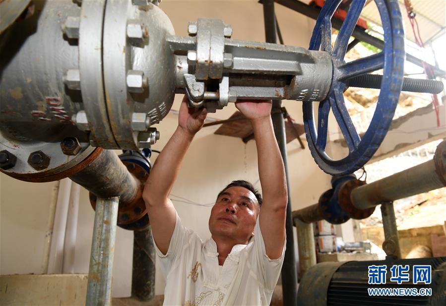 在廣西環(huán)江毛南族自治縣下南鄉(xiāng)抽水站,工作人員在檢查設備(5月22日攝)。新華社記者陸波岸攝。