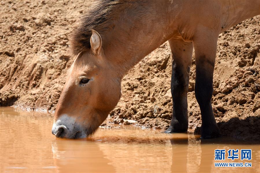 在新疆卡拉麥里山有蹄類(lèi)野生動(dòng)物自然保護(hù)區(qū),一匹普氏野馬在水源地飲水(6月3日攝)。新華社記者丁磊攝。