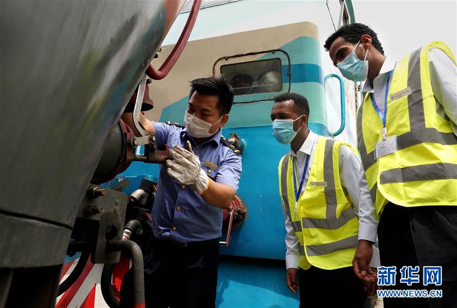 6月5日,帶教司機(jī)在教伊迪內(nèi)卡邱(中)和特瑞薩(右)進(jìn)行機(jī)車(chē)檢查作業(yè)。 新華社記者 李安 攝