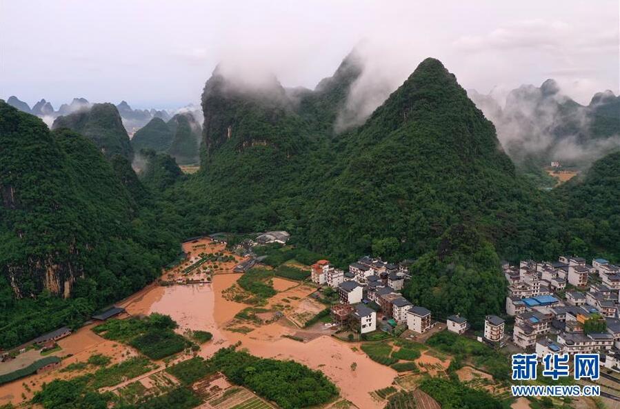 這是廣西陽朔縣部分出現(xiàn)嚴重積水的村莊(6月7日攝,無人機照片)。新華社記者陸波岸攝