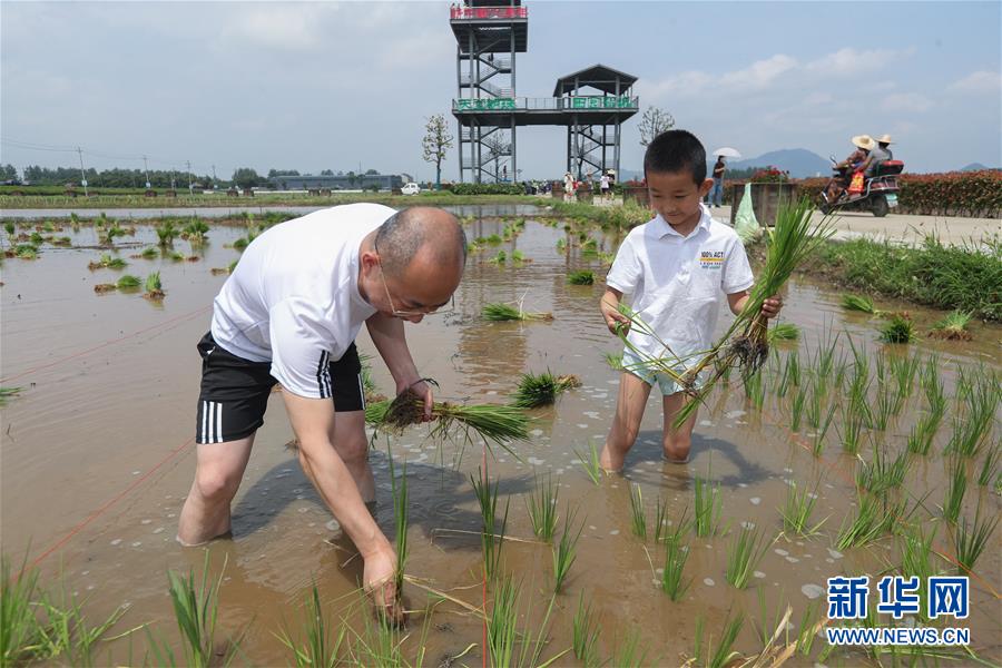 6月7日,孩子和家長在稻田里插秧。新華社記者徐昱攝