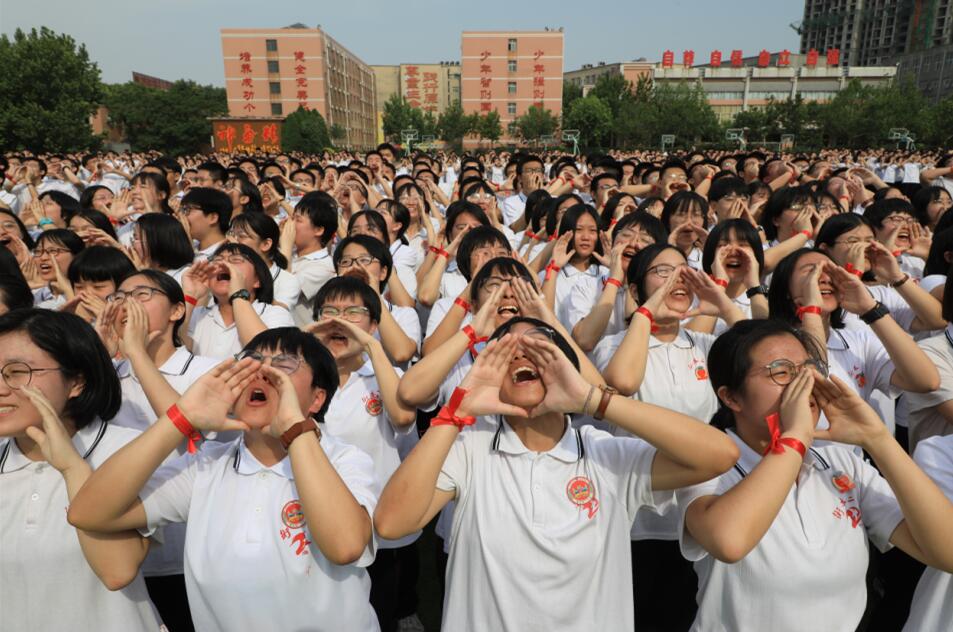 2020年6月6日,河北衡水二中舉行高考倒計(jì)時(shí)30天勵(lì)志動(dòng)員會(huì),通過(guò)向天空喊出夢(mèng)想的方式幫學(xué)生釋放壓力,振奮精神迎高考。