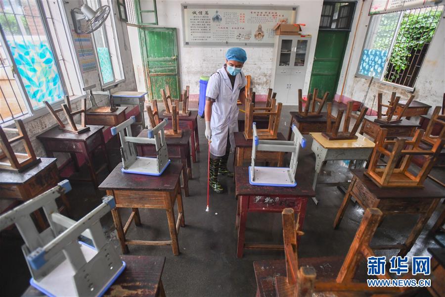 6月8日,在永州市江華瑤族自治縣白芒營(yíng)鎮(zhèn)車下完全小學(xué),白芒營(yíng)中心衛(wèi)生院的工作人員在對(duì)教室進(jìn)行消毒。受近日持續(xù)強(qiáng)降雨影響,湖南省永州市江華瑤族自治縣發(fā)生洪澇災(zāi)害。6月8日,永州市江華瑤族自治縣白芒營(yíng)鎮(zhèn)車下完全小學(xué)開展清淤、消毒工作,為6月9日恢復(fù)上課做準(zhǔn)備。新華社記者陳澤國攝