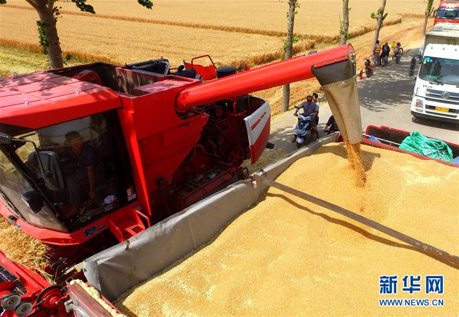 6月8日,在河北省南和縣閆里鄉(xiāng)閆里村,農(nóng)民將收獲的小麥裝車(無人機(jī)照片)。“三夏”期間,河北省預(yù)計組織和調(diào)度小麥聯(lián)合收割機(jī)、拖拉機(jī)、夏玉米播種機(jī)等200萬臺農(nóng)業(yè)機(jī)械投入作業(yè)。新華社記者朱旭東攝