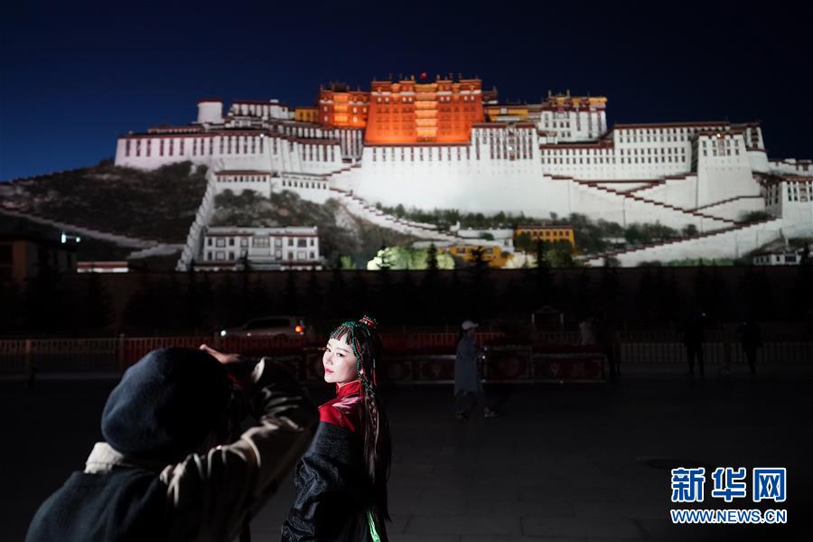 游客在布達(dá)拉宮廣場拍照(6月8日攝)。夜幕降臨,西藏拉薩布達(dá)拉宮燈光璀璨,夜景迷人。新華社記者詹彥攝