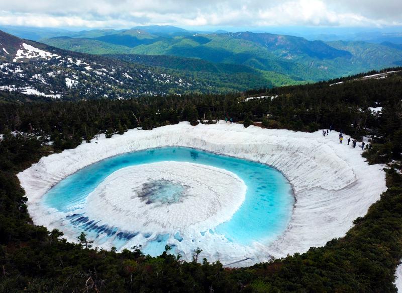 當(dāng)?shù)貢r(shí)間2020年6月8日,日本,在橫跨巖手縣與秋田縣的八幡平山頂附近的“鏡沼”,伴隨著“鏡沼”的積雪從外側(cè)逐漸融化,外圍的碧藍(lán)色湖水與中心部的潔白積雪相映成趣,呈現(xiàn)出獨(dú)特的類(lèi)似“龍眼”的景象。據(jù)悉,八幡平“龍眼”奇景只在每年5月下旬至6月初的雪融期間短暫出現(xiàn)。