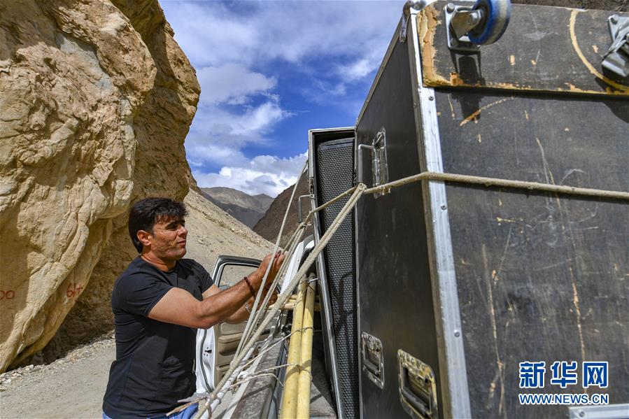 去往達布達爾鄉(xiāng)熱斯喀木村途中,塔縣文工團演員拜合提亞爾·居馬汗在休息時加固車上的演出設備(6月5日攝)。新華社記者胡虎虎攝