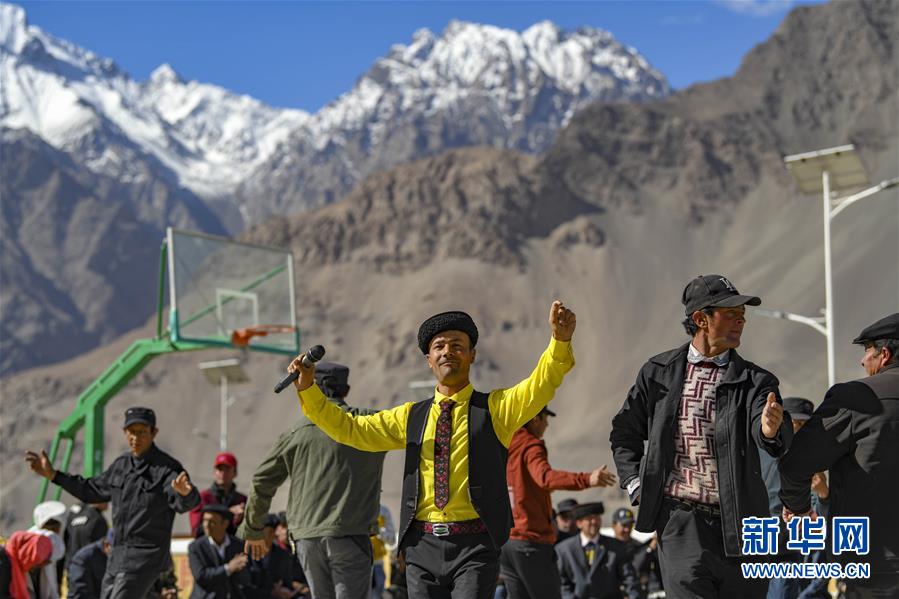 在熱斯喀木村,新疆塔什庫爾干塔吉克自治縣文工團演員阿布都熱蘇力·曼蘇爾汗(身著黃色襯衣者)為村民演唱民歌《我愛你,祖國》(6月6日攝)。新華社記者胡虎虎攝