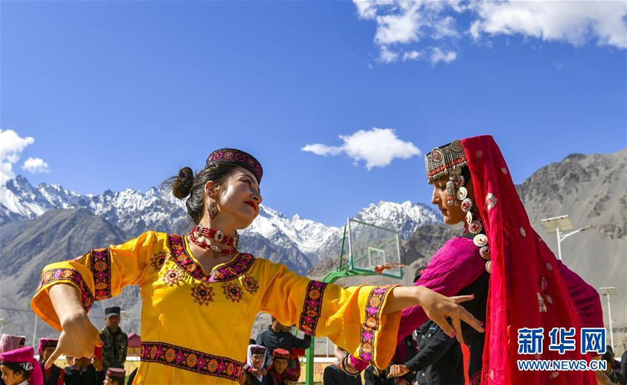 在熱斯喀木村,新疆塔什庫爾干塔吉克自治縣文工團演員(左)與村民一起跳舞(6月6日攝)。新華社記者胡虎虎攝