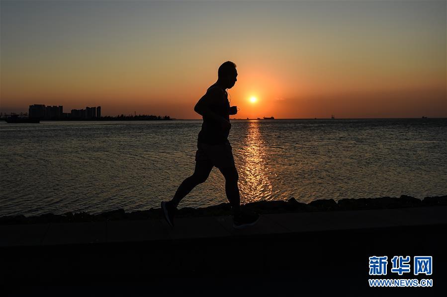 夜幕將至,一位市民在??谑兰o(jì)公園濱海步道跑步(5月15日拍攝)。近年來,夜跑成為越來越多都市人熱衷的健身方式之一。在海南海口,每當(dāng)夜幕降臨,“夜跑族”來到??谌f綠園、世紀(jì)公園等夜跑場所跑步,用一身酣暢淋漓的汗水?dāng)[脫白天工作中的壓力,享受跑步帶來的歡愉。新華社記者 蒲曉旭 攝
