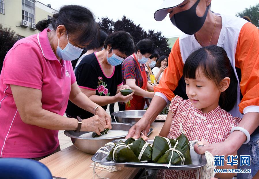6月17日,水清溝街道居民在社區(qū)廣場上包粽子。新華社記者 李紫恒 攝