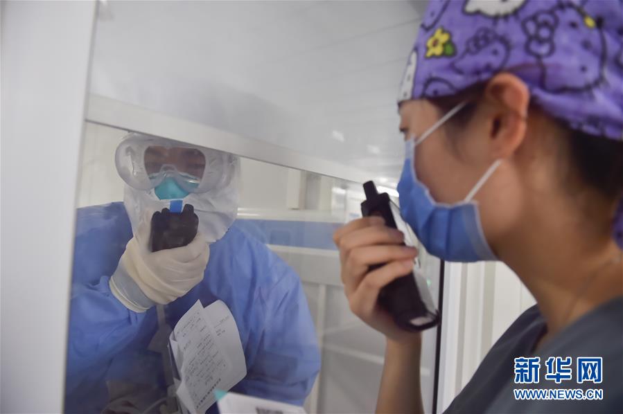 6月19日,在北京地壇醫(yī)院隔離病區(qū),一名來地壇醫(yī)院支援的護(hù)士(左)在跟地壇醫(yī)院的護(hù)士學(xué)習(xí)使用對講機。新華社記者彭子洋攝