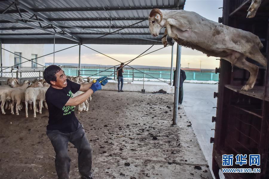 6月12日,在內蒙古烏蘭察布東來順肉類加工廠內,工人將貨車上的綿羊引下車。近年來,京蒙對口幫扶的力度不斷加大。越來越多的北京企業(yè)來到烏蘭察布,通過多種方式幫助當?shù)刎毨У貐^(qū)的農牧民擺脫貧困、走上致富路。新華社記者彭子洋攝