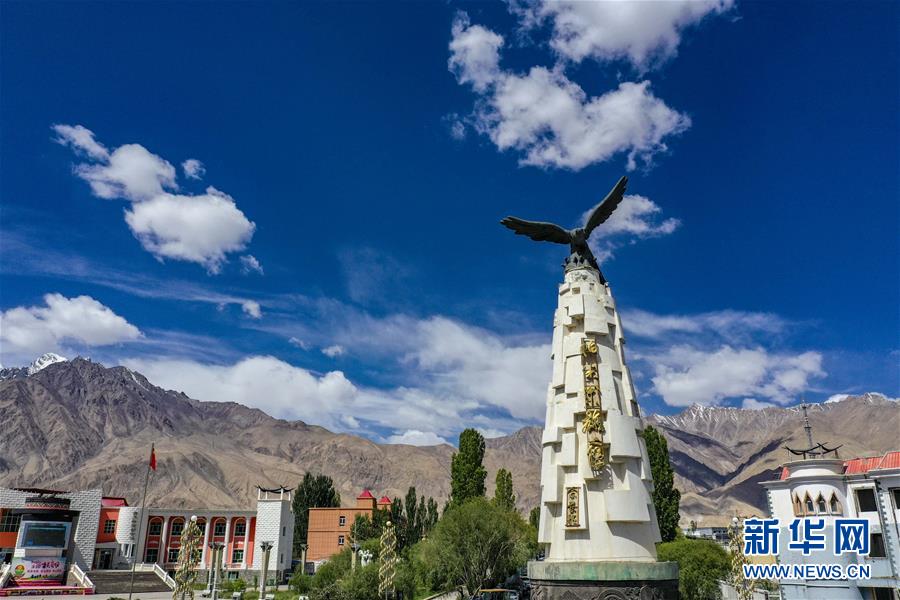 這是位于新疆塔什庫(kù)爾干塔吉克自治縣縣城的“帕米爾雄鷹”雕塑(6月20日攝,無(wú)人機(jī)照片)。新華社記者胡虎虎攝