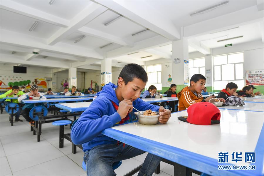 新疆塔什庫(kù)爾干塔吉克自治縣城鄉(xiāng)寄宿制小學(xué)學(xué)生在吃營(yíng)養(yǎng)午餐(6月3日攝)。新華社記者胡虎虎攝